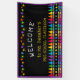 A personalised classroom welcome banner featuring the teacher's name beneath vibrant stars and above a row of crayons in a rainbow gradient. This kindergarten banner showcases colourful crayons and stars set against a black background, with the teacher's name displayed in a playful yellow font. Welcome to school with a bright and cheerful banner!