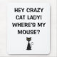A funny mouse pad for a cat lover It says "Hey crazy cat lady! Where's my mouse?". A fun mousepad to go with your computer. A great gift idea for a cat lover.
