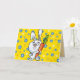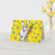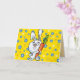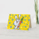 A postcard with a crazy little rabbit and a background of flowers in yellow. Modern, artificial comic / character design. Postcard with Easter bunny and flower backround in yellow. Modern and artful design.