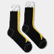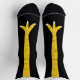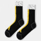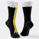 Have fun with these silly chicken leg socks. The base of the design is black with the cartoon interpretation of thin yellow orange chicken legs standing out in contrast with the dark colour. The top of the socks is white representing the start of the chicken's feathers. Use them to brighten up your day and bring laughter and silliness to people around you.