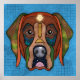 Unique Labrador Retriever crazy dog face with bold, colourful abstract patterns on a blue background. Popular with dog lovers and pet lovers and rescue dog lovers.