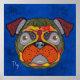 Unique crazy pug dog face with bold, colourful abstract patterns on a blue background. Popular with dog lovers and pet lovers and rescue dog lovers.