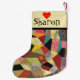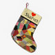 The colourful crazy quilt design on this Christmas stocking has a patchwork of fabric decorated with different colours and patterns including polka dots, swirls, stripes, burlap texture, and more.  Colours include pink, brown, turquoise, yellow, grey, black, orange, olive green and red. The top band is cream coloured with a red heart and a monogrammed name for you to personalise on both sides of the stocking. Makes a great holiday gift! Designed by artist © Tim Coffey.