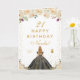 This elegant and glamorous birthday card can be personalized with a name or title such as daughter, granddaughter, niece, friend etc. The design features a beautiful princess with blonde hair and fair skin in a black ball gown. The text combines handwritten script and modern sans serif fonts for a classy and sophisticated look. The floral arrangements, butterflies and gold confetti create the perfect blend of rustic and chic.