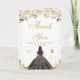 This elegant and glamorous birthday thank you card features a beautiful princess with dark hair and dark skin in a black ball gown. The text combines handwritten script and modern sans serif fonts for a classy and sophisticated look. The floral arrangements, butterflies and gold confetti create the perfect blend of rustic and chic.