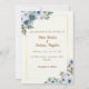 Invite your guests to your special day with this elegant cream wedding invitation card with gold border and blue floral arrangement.
