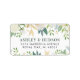 Stylish wedding return address labels feature custom rich green and soft black text that can be personalized, framed by a floral watercolor design with painted roses, ranunculus flowers, and foliage. Color scheme includes soft white, cream, gold, and green colors.