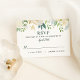 Classic style wedding RSVP cards feature an elegant floral watercolor design with painted roses, ranunculus flowers, and leaves in neutral shades of white, cream, gold, green, and dark grey. Perfect for a spring or summer event. The back of the card features a creamy gold colour with brushed white horizontal stripes. Personalise the custom text with your RSVP due date.