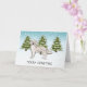 Destei's original cartoon illustration of a cute English cream coat colour Golden Retriever breed dog. The dog is placed in a winter scene with three green fir trees and falling snow. The background is a blue to white gradient giving the design that cold winter day look. There is also a personalizable text area that now reads: "Merry Christmas".