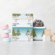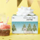 Destei's original cartoon illustration of a cute English cream Golden Retriever breed dog. The dog is placed in a winter scene with three green fir trees. The background is a blue to white gradient giving the design that cold winter day look. There is a personalizable text area that now reads: "Merry Christmas!" together with a custom name.