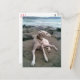 This fun canine postcard features an image of a cream greyhound puppy dog resting on a rock with a the ocean and mountains in the background. The back of the card is blank for your message.