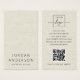 Modern, vertical business cards with your name and title on the front on a cream coloured printed linen look background. Customisable template fields for your contact information and logo on the back. You can move and resize elements with the design tool.
