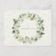 A cream, flat, winter wedding reception enclosure card featuring an edging of hand painted snowberries and eucalyptus on the front and a wreath on the back of the card. All text is fully editable and the scattered dots on the front and back can be deleted before ordering if you would prefer. This card is available with alternative botanical designs, in a portrait format, and in different colours. Please view the Collection in my store to see all options and coordinating items.