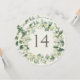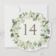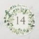 A cream circular or square double-sided wedding table number card featuring hand painted snowberries and eucalyptus arranged into a beautiful botanical wreath. The text is fully editable. Other designs, table number products and coordinating items are available in my store.