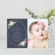 Invite friends and family in style and set the tone for your special day with this elegant first holy communion invitation. Design features white watercolor flowers, greenery and gold frame on navy blue background.