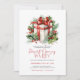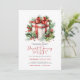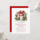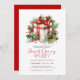 Create your ideal Christmas presents opening party invitation featuring a lively and festive Christmas present box embellished with vivid decorations, an elegant red cursive font. Personalise it with party details in grey and red font to suit your party information.