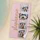 Photo collage in a film strip layout with a huge modern script for the name. Use up to four square or selfie phone photos to create a unique and personal gift. Or you can keep the hipster puppy and make a trendy keepsake. For best results, use photos that have been cropped into squares before uploading. If you need to adjust the pictures, click on the customise tool to make changes.