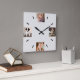 Modern custom clock features 4 square photos at the 12, 3, 6, and 9 o'clock positions on a neutral grey background. Black dashes mark the other hour positions around the clock. Easily replace the sample images with your own in the sidebar.