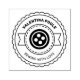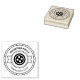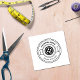 This "Sewing with love" rubber stamp features a badge with a button, a slogan and custom name.