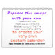 Create your own personalised calendar - We have made this SO Easy, just replace the images with your own, we added which size images for you to use depending on the calendar size you want - Make your own personalised Calendar - Add your own photos, artwork or designs to this Custom Create Your Own calendar - Add text too- change fonts, size and colours of fonts to suit your needs. Make sure to see the drop downs for Culture, Holiday choices, Start Date, Size, binding colour etc. all the choices on the right side before you order -