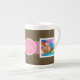 Create your own monogrammed Mum rustic tea cup- Thoughtful gift for wife, mum or for Grandma on Mother's Day to display favourite family photos and enjoy memories while she savours her afternoon tea. Rustic brown burlap look background with dark pink banner. Reads Mum in whimsical letters that look like they were handwritten by a child on a pink centred circle. Both sides display a custom family photo on white square frames. Add pictures of kids or favourite family pictures. Unique, personalised gift that will become a keepsake for Mum or Grandma. Cute country kitchen decor accent.