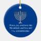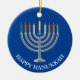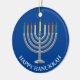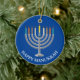 Create Your Own Hanukkah Menorah Ceramic Ornament. Menorah with nine candles and star of David on a blue festival of lights background on the front and back of the ornament. Happy holiday greetings and name of the family on the back. Place your own text, as desired.