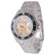 Has heft and feel of expensive stainless steel quartz watches. Good band with safety catch. I removed links, which is easy because engraved arrows show direction to push the linking pins. As always by this seller, the image (a railroad logo) is a perfect reproduction of my emailed image, and is precisely spaced and aligned.
