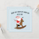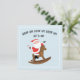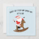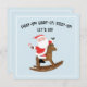 Funny modern holiday party invites featuring Santa on a rocking horse and humourous line.