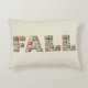 A cosy decorative pillow featuring the word “FALL” spelled out in bold faux quilted patchwork letters. Each letter is made of different fabric patterns in warm autumn tones like orange, brown, teal, and cream, creating a rustic farmhouse and seasonal feel.