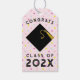Pink graduation gift tag party favour design featuring black cap with gold tassel on polka-dot background. Edit text to personalise.