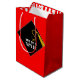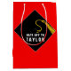 Graduation gift bag featuring black and gold cap design on a red background. Edit text to add senior grad's name.