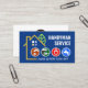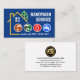 A blue cover features a creative building frame that houses a handyman tools icon design. The tools can represent some of the services that you might offer e.g. the brown drill-measuring tape can represent home repairs, the green brushes for painting-remodeling etc. Over at the top of the card lies the business name "HANDYMAN SERVICE" with the contact details near the base.