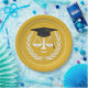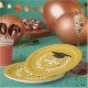 Unique law school grad party plates design featuring creative scales-of-justice personified wearing black and gold graduation cap.