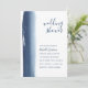 Modern and creative couples wedding shower invitation featuring a simple design with a navy blue watercolor brushstroke on the left side, over a white background. On the top right is the event title in a handwritten font, in right alignment. On the bottom left are your event details in a sans serif font, in left alignment. The backside is a solid navy blue. These unique invitations are great for an artistic couple.