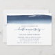 Modern and creative horizontal death anniversary invitation featuring a simple design with a navy blue watercolor brushstroke across the top, over a white background. The title is in a handwritten font with swashes and the event details are in a sans serif font. The backside is a solid navy blue. These unique invitations are great for the person who had an artistic flair.