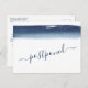 Modern and creative Wedding Postponement Announcement Postcard featuring a simple design with a navy blue watercolor brushstroke across the top along with the word "postponed" in a handwritten font with swashes. The backside has your personal message and return address for easy mailing. This unique design is great for an artistic couple.