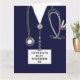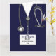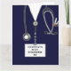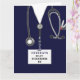 Nursing school graduation card featuring navy-blue hospital scrubs, stethoscope and a Swiss Army knife. Edit text to add nurse's name.