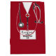Unique nurse gift bag featuring hospital scrubs, stethoscope, and a big congrats. To personalize edit text to add nurse's name.