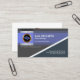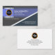 A dark grey cover with stylish re-bar stripes sit at the top left corner. It has an underlying blue column that houses the gold logo of a city silhouette with your prestigious name and job title beside it. The business name is just below with a corresponding slogan option underneath the logo. A dark blue triangle with an underlying white layer sits at the lower right corner stores the contact details.