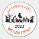 Happy Halloween cool black typography concept design where letters are made with halloween symbols images. Orange and yellow abstract background. Customisable text halloween sticker template.