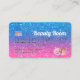 An elegant modern, stylish beauty credit card style business card with a modern script font typography on a chic faux bright pink glitter and blue ombre trendy background. all text is customizable, add your social media. Featuring faux rose gold stripe. Add your logo, your monogram and QR code.