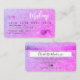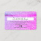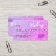 An elegant modern, stylish Hair and makeup artist credit card style business card with a modern script font typography on a chic faux purple pink glitter trendy background. all text is customisable, add your social media. Featuring faux rose gold stripe. Add your logo, your monogram and QR code.