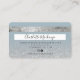 An elegant modern, stylish beauty Hair and makeup artist credit card style business card with a modern script font typography on a chic faux grey silver glitter ombre gradient and glam dusty blue trendy background. all text is customisable, add your social media. Featuring faux silver stripe. Add your logo, your monogram and QR code.