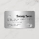 An elegant modern, stylish beauty Hair and makeup artist credit card style business card with a modern script font typography on a chic faux gray silver metallic foil glam trendy background. all text is customizable, add your social media. Featuring faux silver stripe. Add your logo, your monogram and QR code.