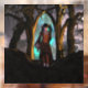 A creepy but cute girl dressed in Halloween colours holding a teddy bear steps through a spooky tree portal from another dimension into a lightning storm.