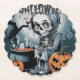 A spooky Halloween scene with a skeleton inside a pumpkin, surrounded by eerie elements.