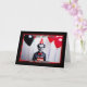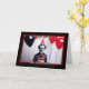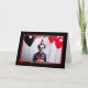 This card is a birthday greeting with a Halloween theme. It features a spooky clown wearing a red party hat and bow tie, holding a birthday cake with red candles. The clown has a sinister smile and exaggerated facial makeup, typical of a creepy Halloween character. The background has black and red balloons with colourful streamers. The card is framed with a red and black striped border.
