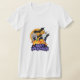 This Halloween-themed T-shirt features a spooky design with a full moon, flying bats, a skeleton dressed as a ghost, three carved pumpkins, bare tree branches, and a gravestone with “RIP” inscribed. The text “Happy Halloween” is prominently displayed at the bottom.