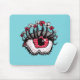 Weird eye mousepad with a digital illustration depicting a creepy red eye with eyelashes which have their own eyelashes and are ending in flowers red and gray flowers over cheerful blue background. When sometimes your eyes are so strained that you are sure they will melt in the next three seconds. This psychedelic design is just for you if you like bright colors and weird art.