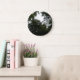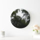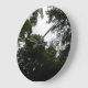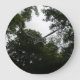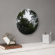 This awesome clock features a photograph taken from within a dense forest. The photograph shows the darkness of the trees and a small area of grey sky. The result is an eerie and atmospheric scene.